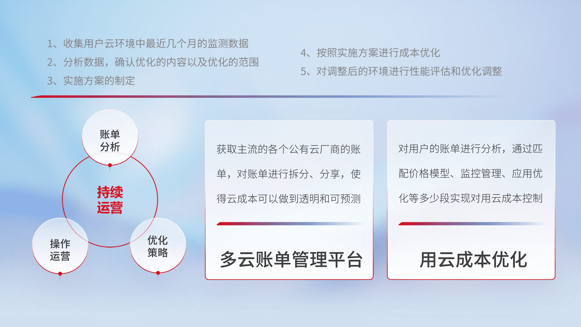 通过多云纳管,,,以统一的资源数据模型把客户的云资源进行抽象和封装,,进而实现对多云资源的统一操作,,,,保障云资源管理的可靠性、、、、稳定性与可用性。。。。量身定制化运维内容,,,配置、、开发运维、、、补丁管理、、备份、、、监控、、认证和访问管理、、、审计和日常巡检等,,,保障在用云过程中的可靠度,,,稳定度以及高可用率。。